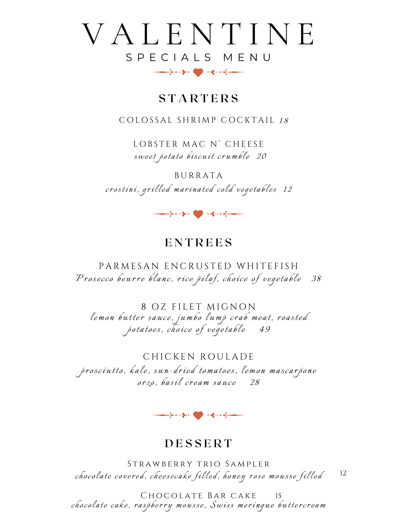 Our Valentine Specials Menu will be served, in addition to our regular dinner menu.